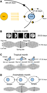 (A) Schematic of the movements of Moon and Earth around the Sun (sizes of Sun, Earth, and Moon and distances between them are not to scale).